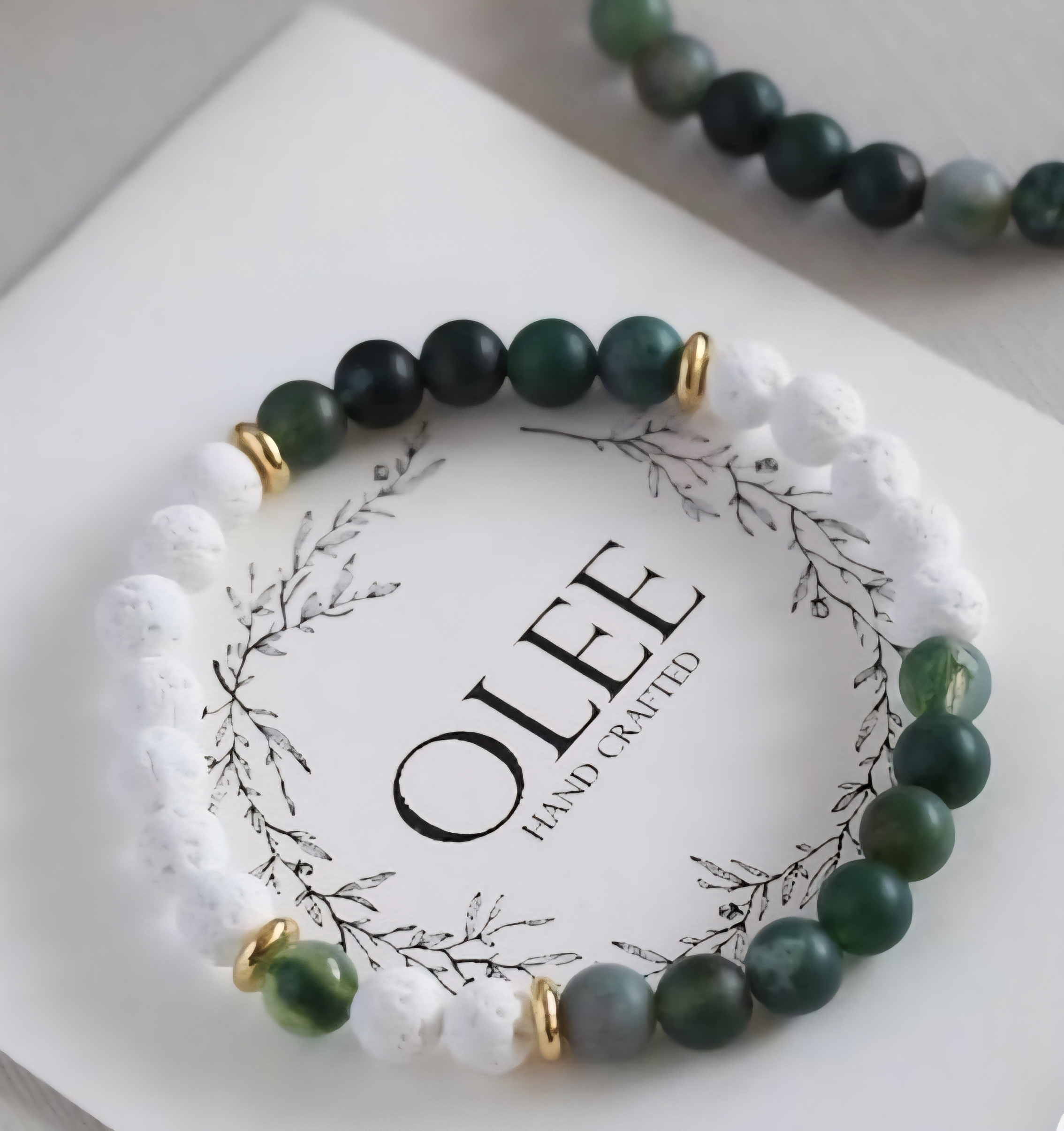 🦋 دستبند عقیق خزهای با واشرهای استیل